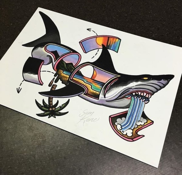 彩色大海风景纹身动物解剖鲨鱼纹身手稿图案