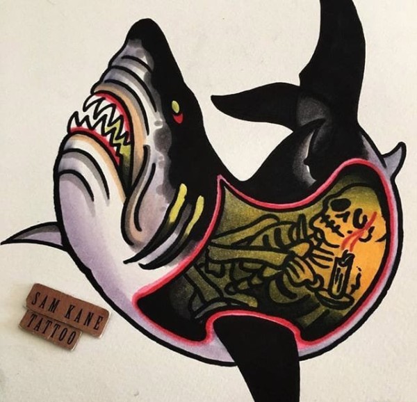 彩色大海风景纹身动物解剖鲨鱼纹身手稿图案