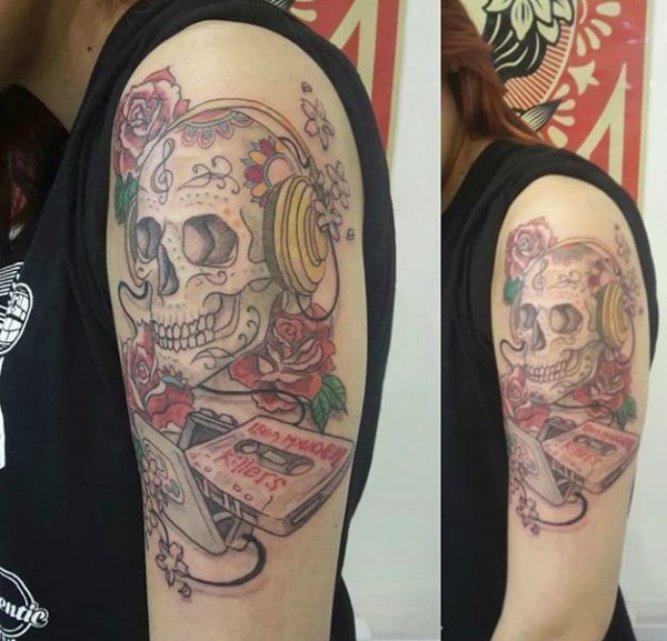 黑色简单个性纹身水彩随身听和磁带和耳机纹身图案
