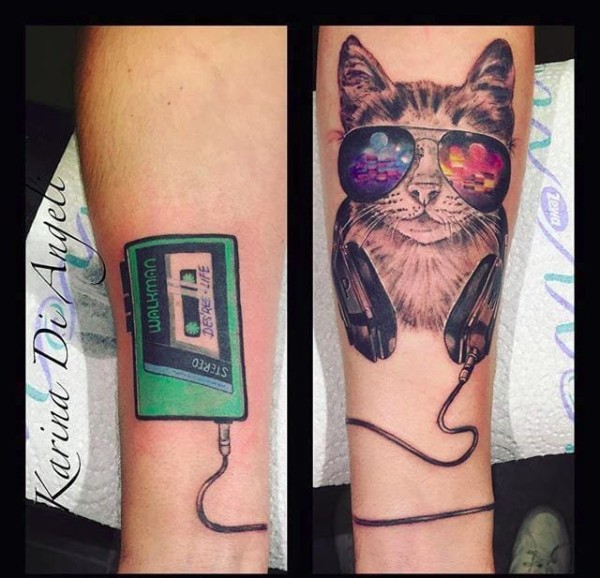 黑色简单个性纹身水彩随身听和磁带和耳机纹身图案