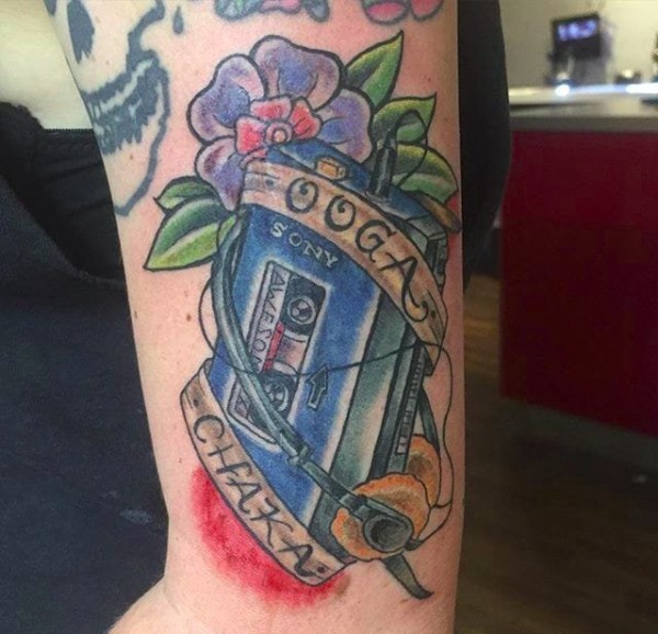 黑色简单个性纹身水彩随身听和磁带和耳机纹身图案