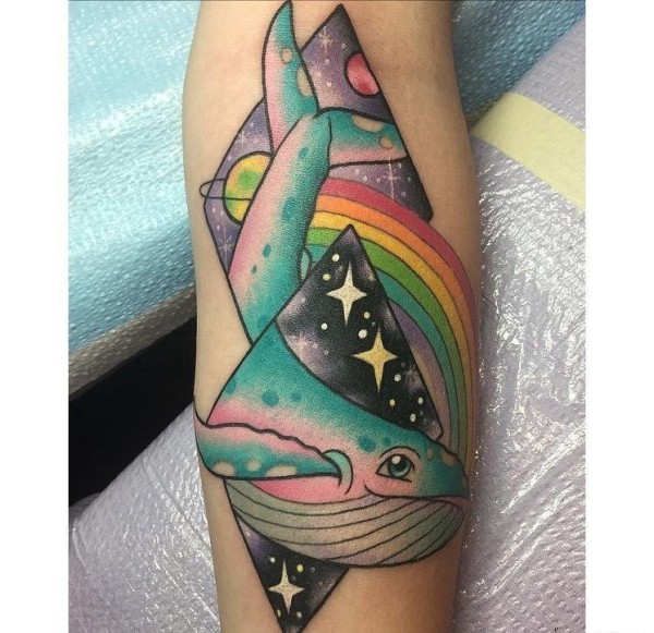 手臂彩色纹身鲸鱼纹身星球纹身彩虹几何纹身图片