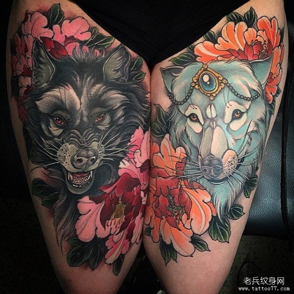 大腿欧美school狼头牡丹花性感纹身图案