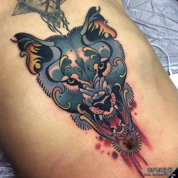 腹部欧美狼头彩色纹身图案