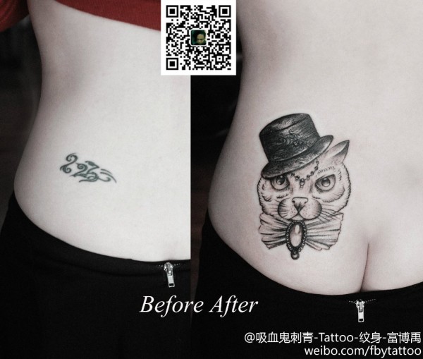 女生后腰纹身黑白灰风格抽象线条纹身图案