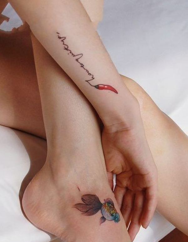 女生脚背金鱼和手臂辣椒个性纹身图案