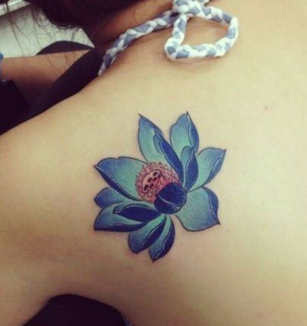 美女肩背好看的彩色莲花刺青图片