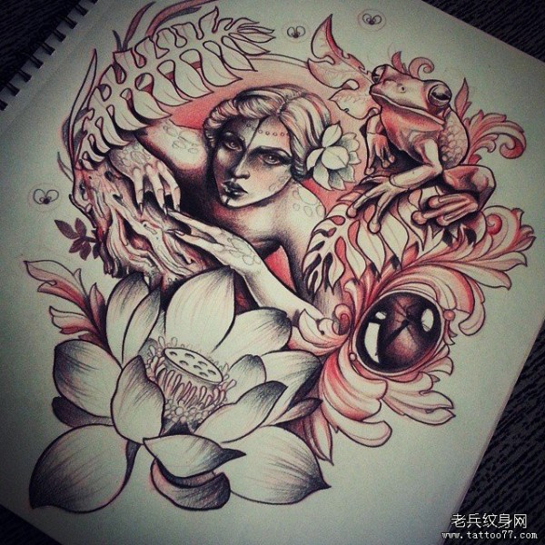 欧美女郎莲花青蛙植物纹身图案手稿