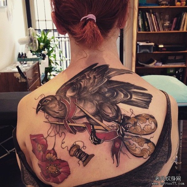 背部欧美鸟花朵飞蛾school纹身图案