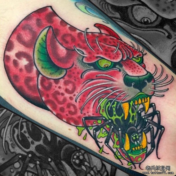 小腿欧美school红色豹子和蜘蛛纹身图案