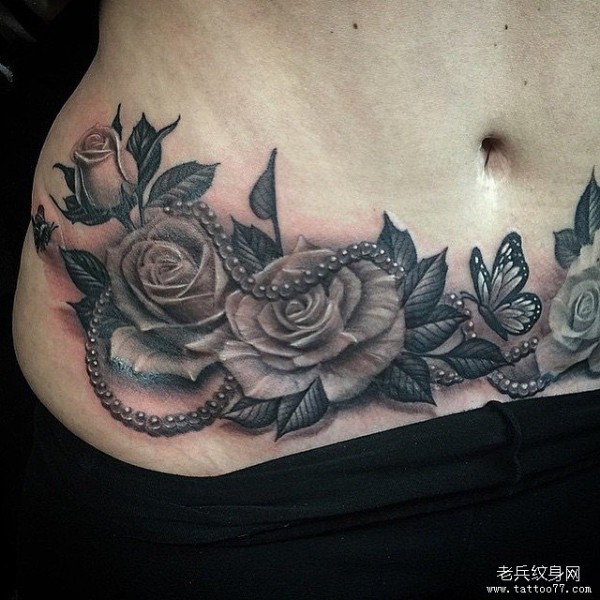 腹部欧美玫瑰珍珠蝴蝶黑灰纹身图案