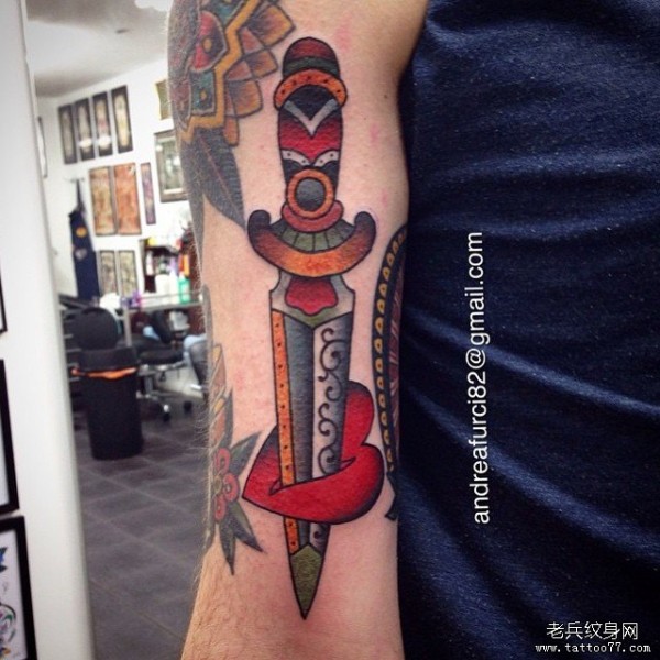 大臂欧美school匕首心形纹身图案