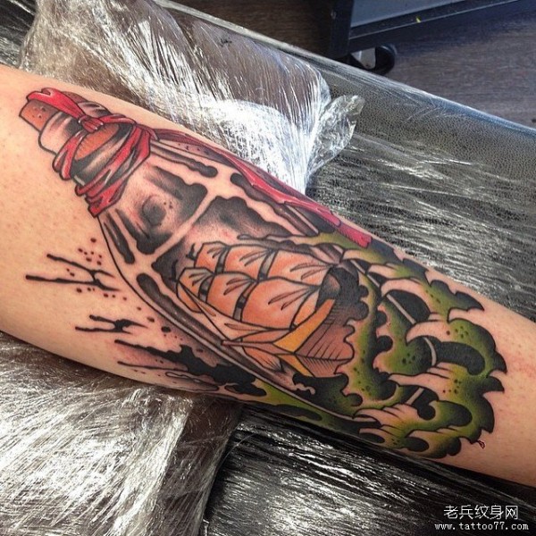 小腿old school瓶子帆船纹身图案