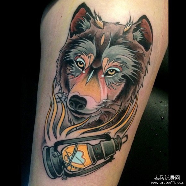 大腿欧美new school狼头灯纹身图案