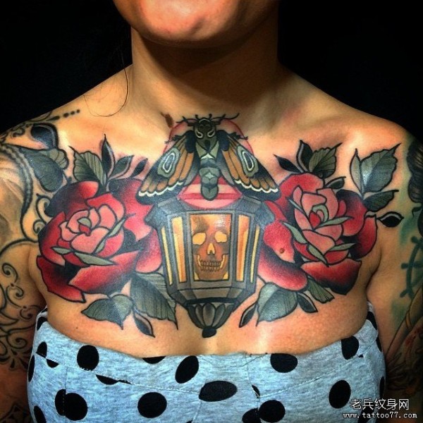 胸部欧美花卉灯飞蛾纹身图案