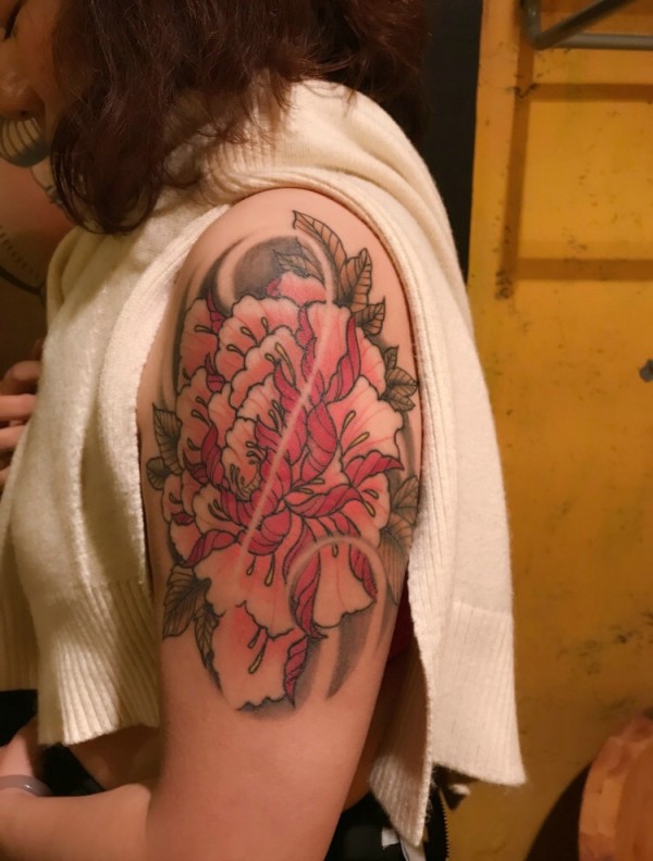 个性女孩手臂鲜艳的牡丹花纹身图案
