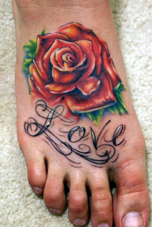 脚背个性的花体英文和玫瑰纹身图案