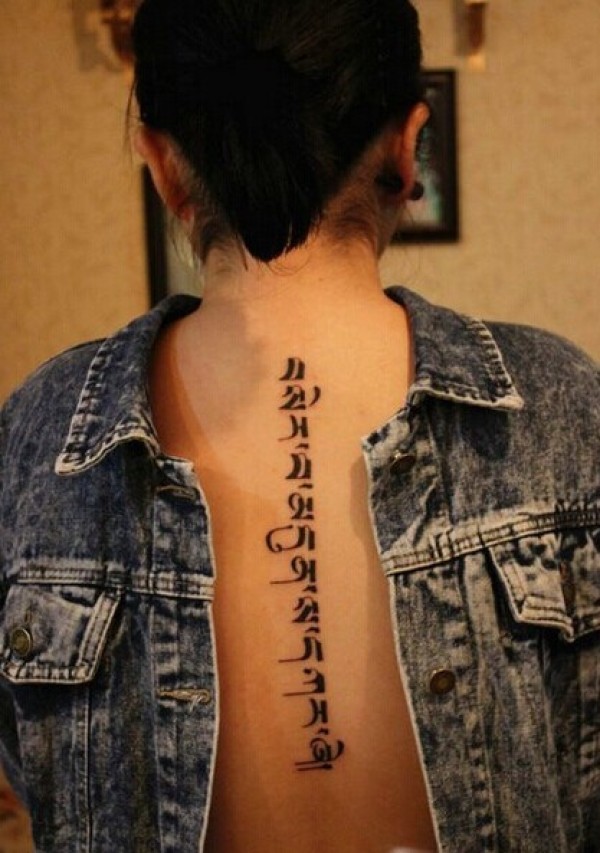 洋气美眉的背部梵文纹身图案