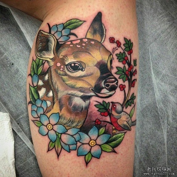小腿欧美school小鹿小鸟花卉小清新纹身图案