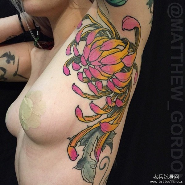 侧肋漂亮的欧美传统菊花纹身图案