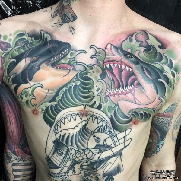欧美胸部鲸鱼和鲨鱼纹身图案
