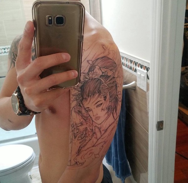 男性黑色日本风格纹身线条手臂艺妓纹身图片