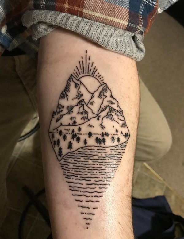 男性黑色手臂山水纹身几何图简单个性线条纹身图片