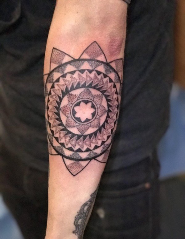 手前臂上漂亮的点刺风格曼陀罗图案纹身