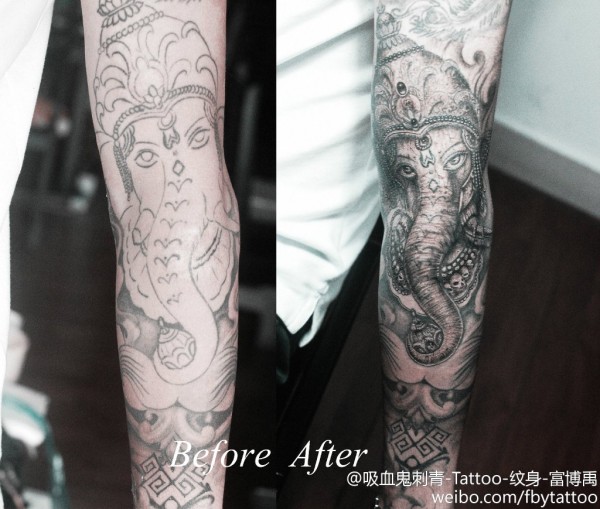 手臂黑灰象神_一组12张手臂上的黑灰象神纹身图案作品欣赏