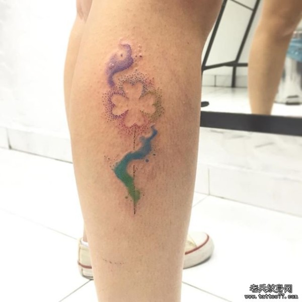 小腿小清新点刺泼墨花卉纹身图案