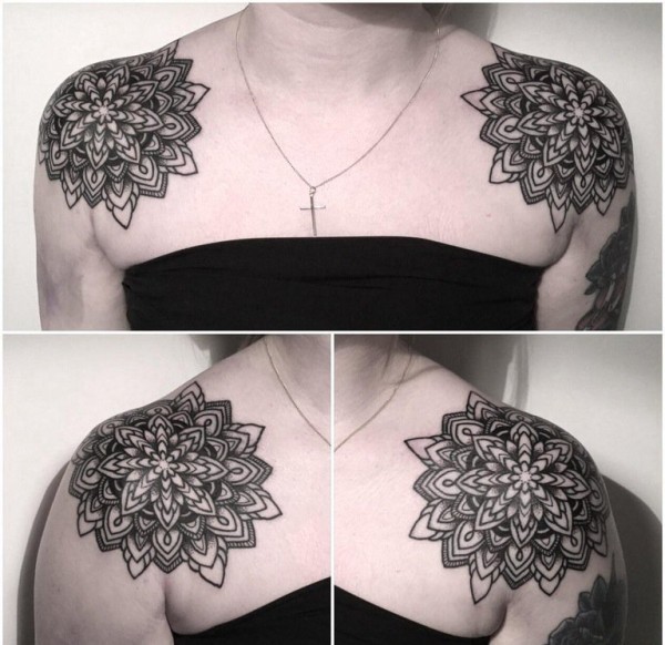女性肩膀上黑色几何纹身曼陀罗图案纹身