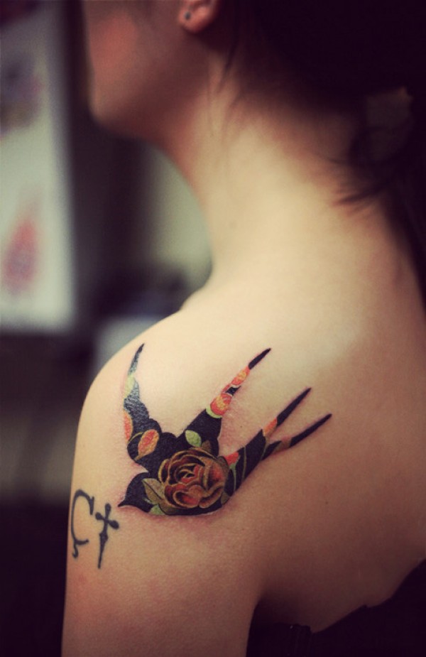 燕归巢,披肩玫瑰燕子纹身图案