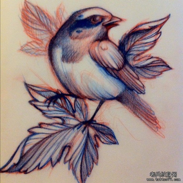 欧美school鸟树叶小清新纹身图案手稿