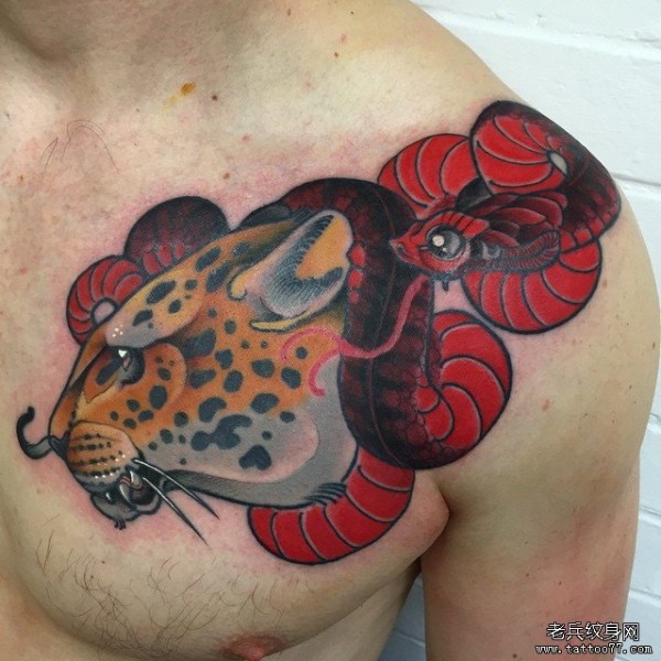 胸部欧美豹头与红色的蛇纹身图案
