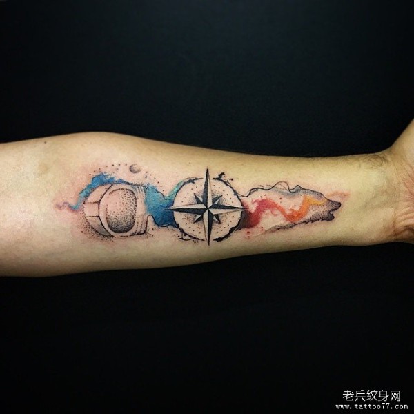 小臂欧美泼墨指南针纹身图案