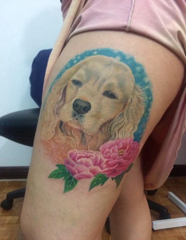 大腿上彩色植物纹身小花朵和狗头纹身图片