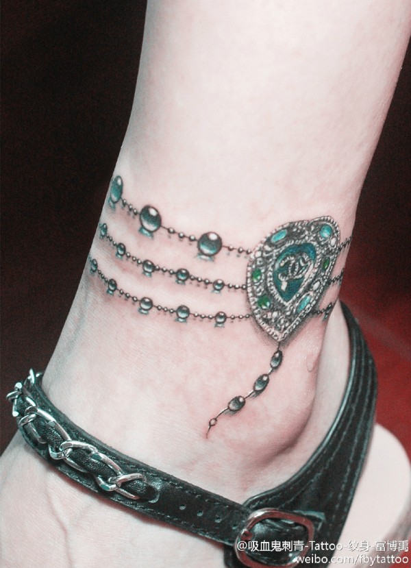 脚链纹身采用蓝色珠子来烘托主体的CHANEL吊坠
