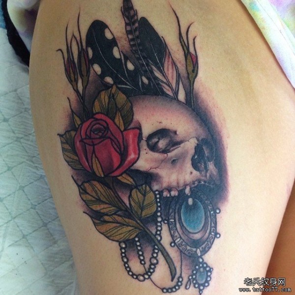 大腿欧美性感骷髅花卉宝石纹身图案