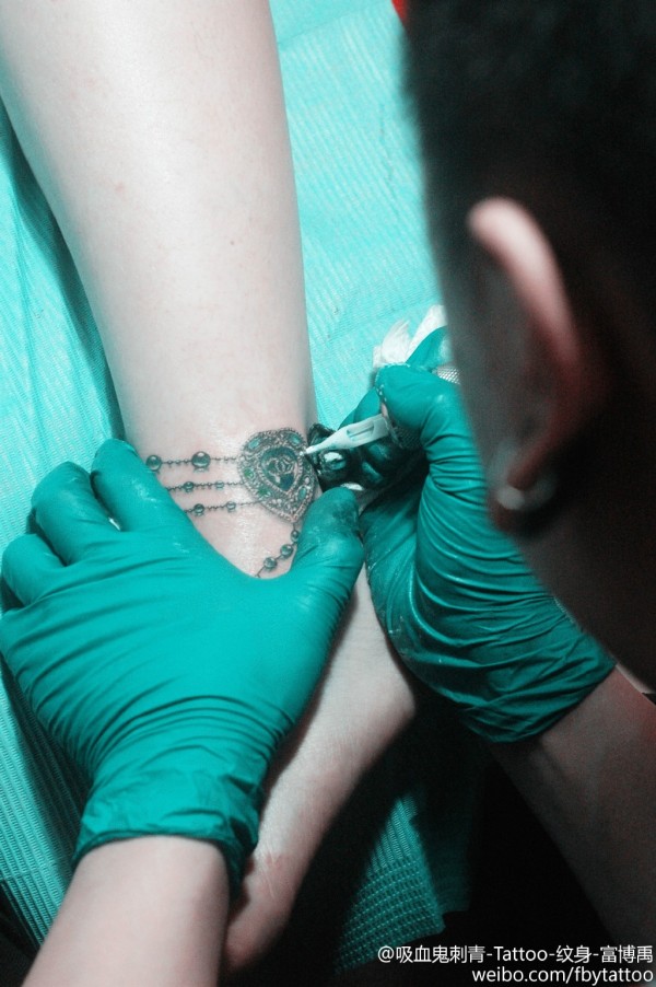 脚链纹身采用蓝色珠子来烘托主体的CHANEL吊坠