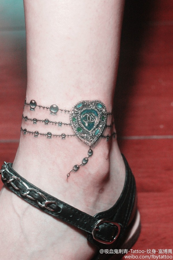 脚链纹身采用蓝色珠子来烘托主体的CHANEL吊坠