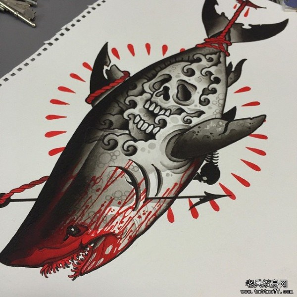 欧美血腥鲨鱼骷髅school纹身图案手稿