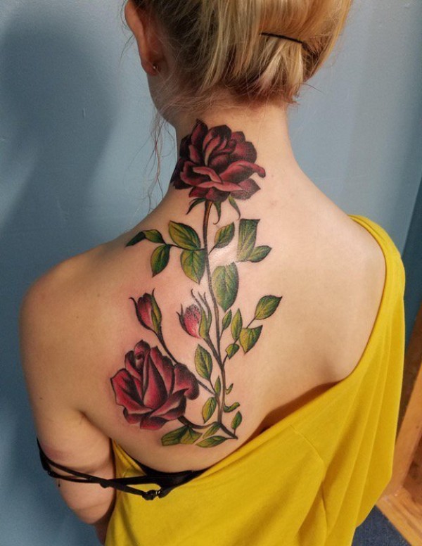 美女蝴蝶骨纹身鲜艳的植物藤彩色纹身玫瑰花图案