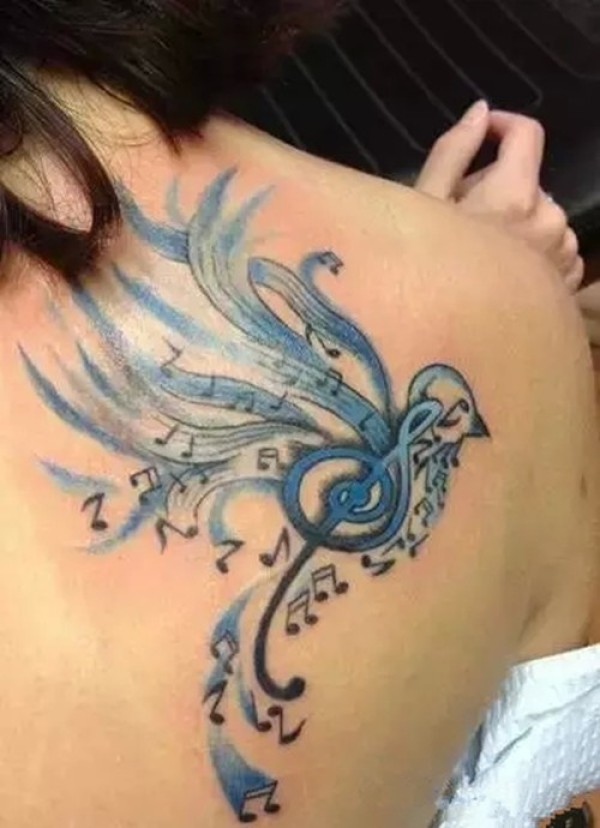 女性后背音符小鸟纹身图案
