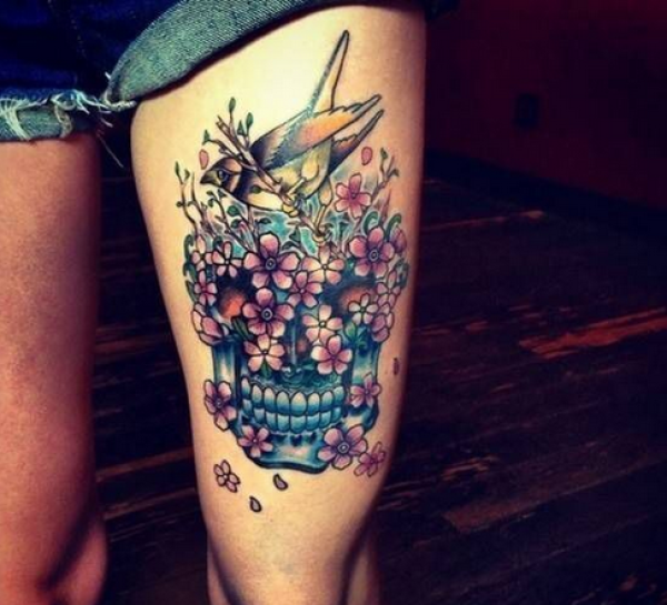女性腿部彩色骷髅小鸟花卉纹身图案