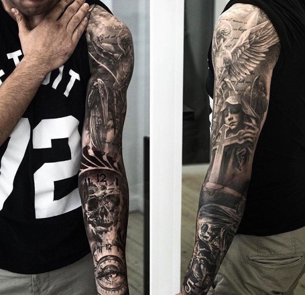 22款黑灰色的欧美满臂纹身时尚花臂纹身图案