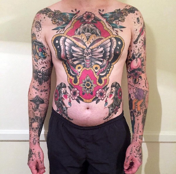 男性前背上彩色传统纹身动物蝴蝶和人物肖像纹身图片