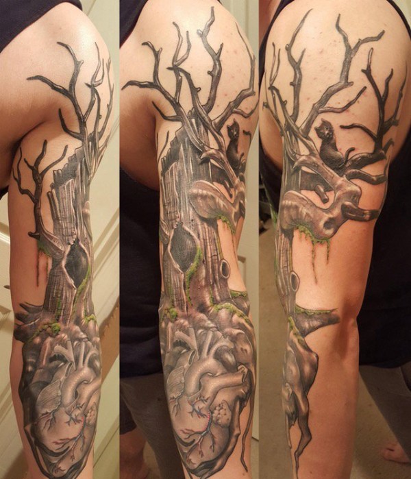 男性手臂上黑灰色机械心脏纹身和树纹身图片
