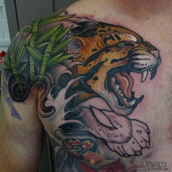 胸部传统老虎竹子彩绘纹身图案