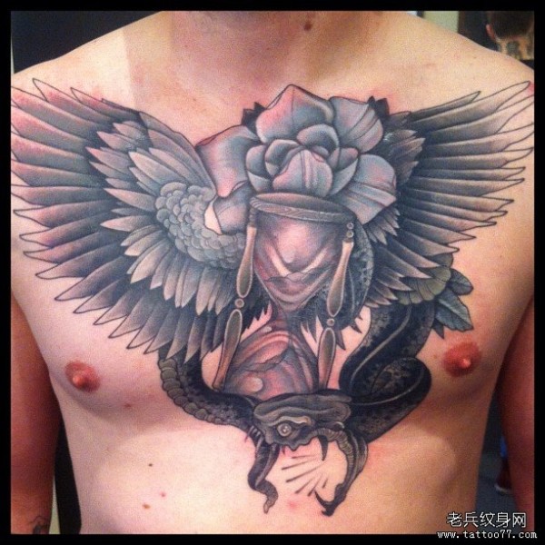 欧美胸部翅膀沙漏蛇玫瑰纹身图案