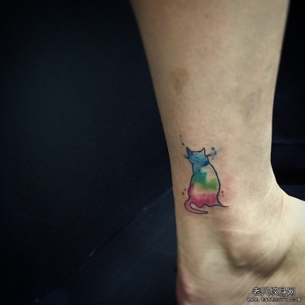脚踝小清新泼墨猫纹身图案